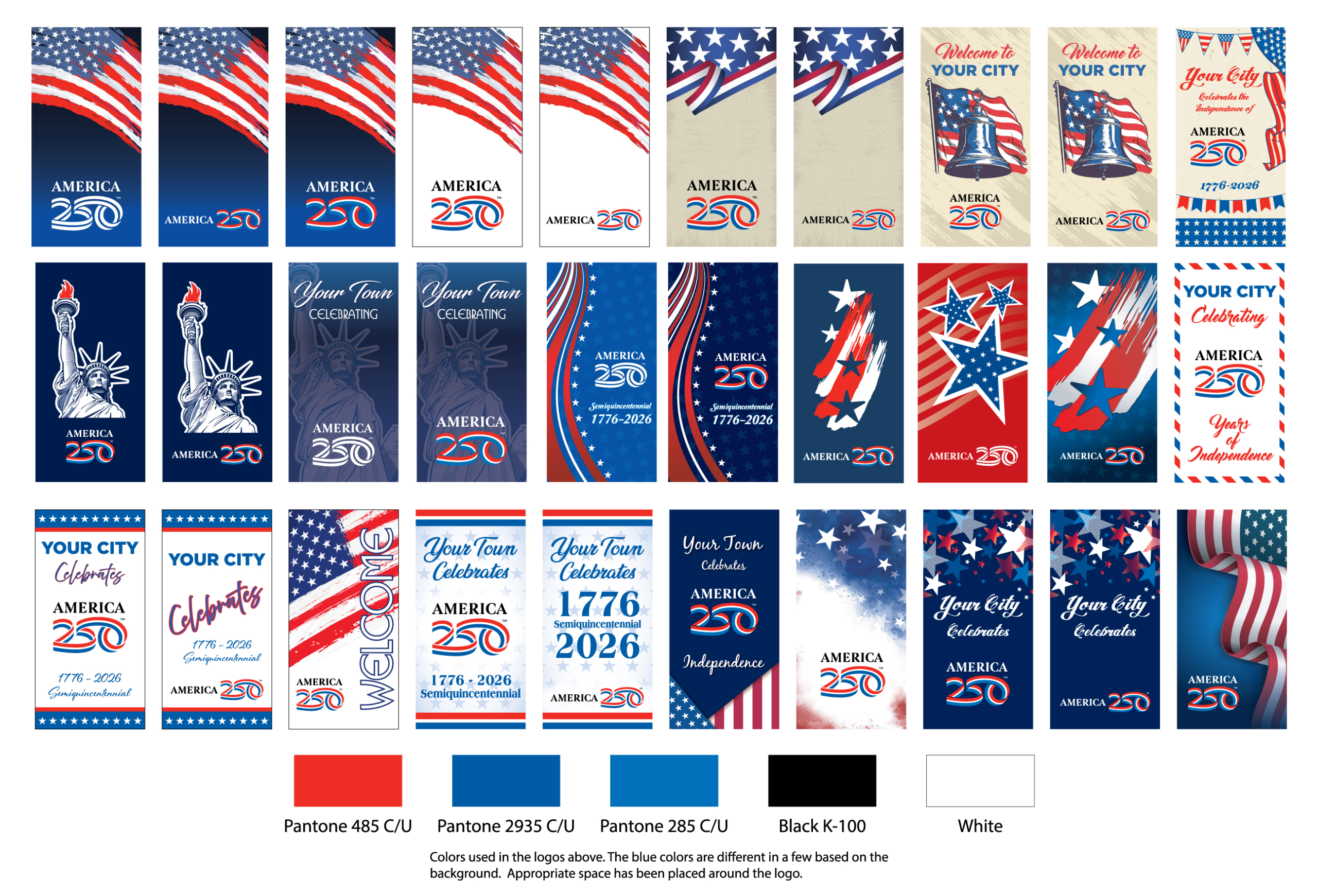 Each banner design captures the American spirit with bold red, white, and blue themes, historic imagery, and “250 Years Strong” messaging. You can choose from multiple layout styles or work with our design team to create something custom for your city or organization.