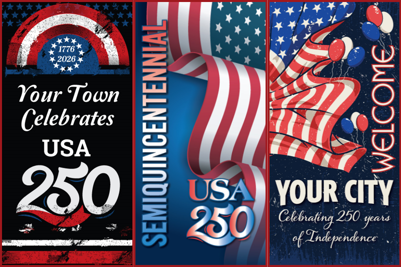 Short phrases work best. Think “Celebrate 250,” “USA 250,” or “250 Years.” Add your community name when space allows. Repeat the core theme across the full banner set.