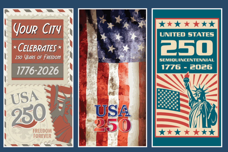 Highlight local history, founding dates, or hometown heroes. You can also pair city logos with official 250th iconography.